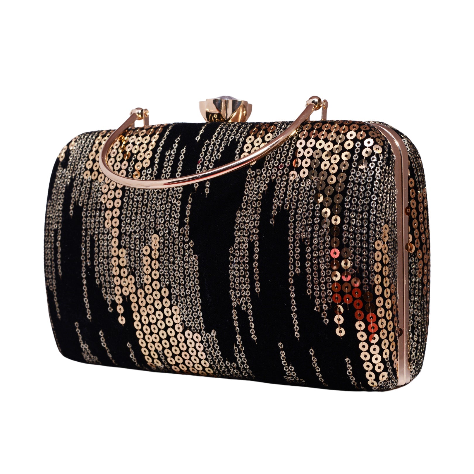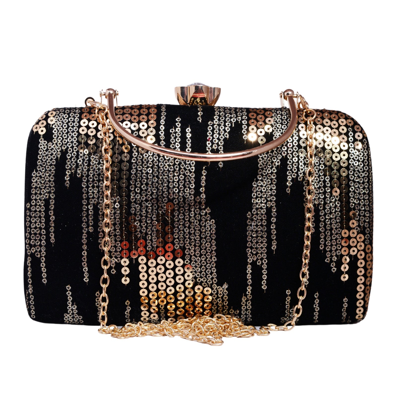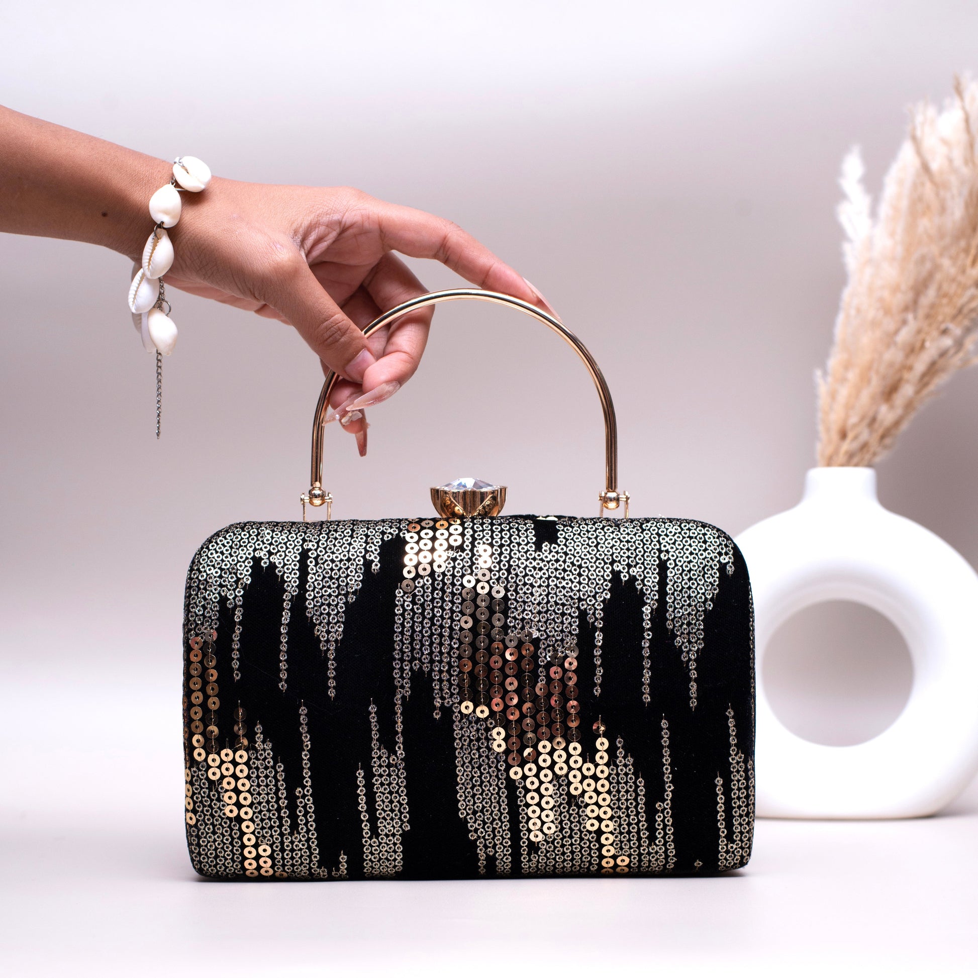 Expertly designed with a metal frame and plastic hard case, this clutch features a sleek combination of plain suede fabric on the outer layer and raw silk fabric on the inner lining. It also includes a designer lock and handle, and with dimensions of 8 * 5, it can accommodate phones of various sizes. Experience the perfect blend of style and functionality with this Black Embroidery Clutch with Golden Sequins