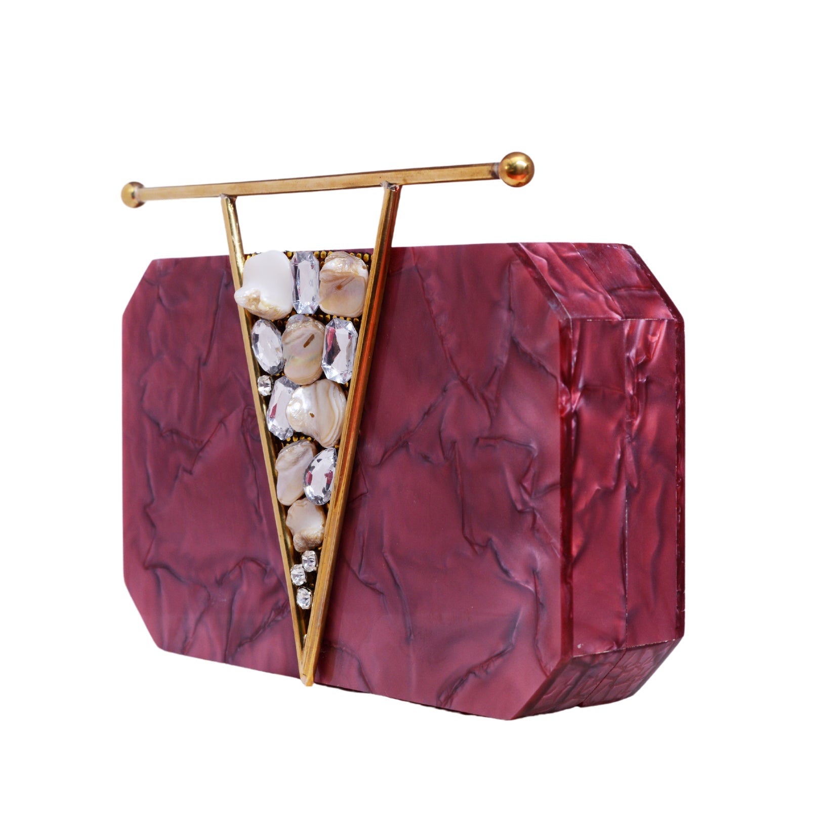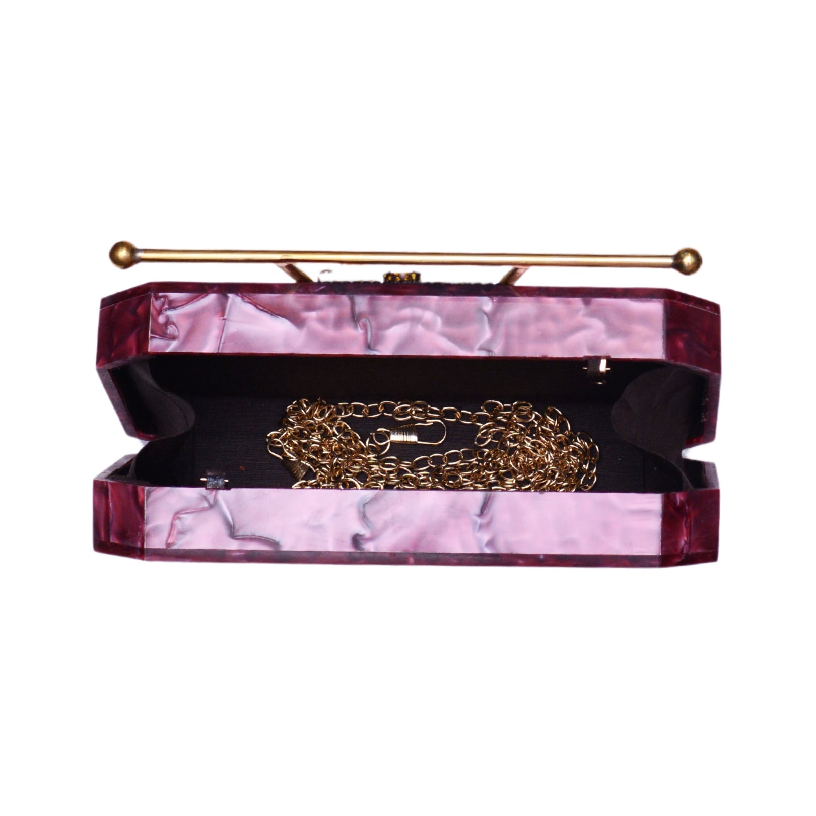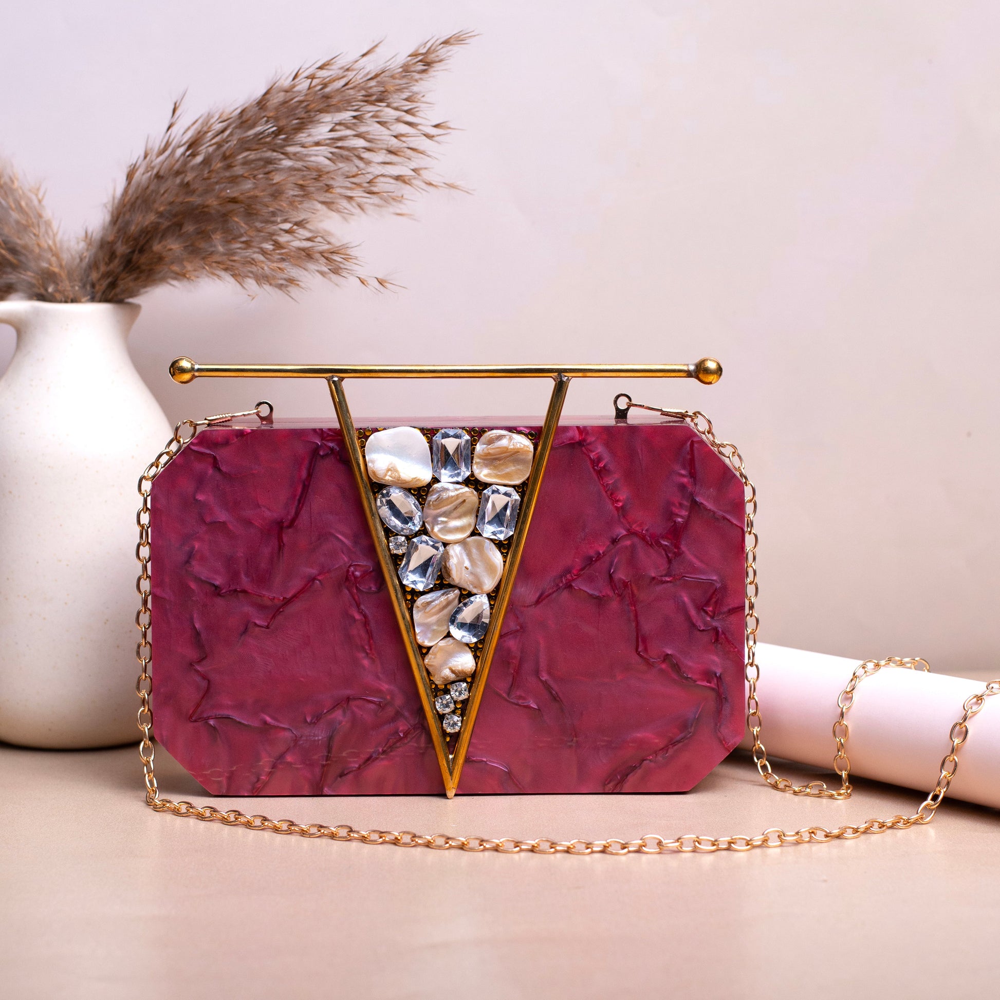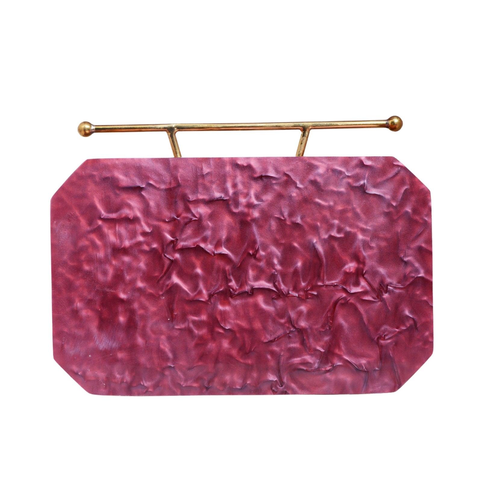 The Deep Red Acrylic Clutch with Metal Handle is a fashionable accessory measuring 8* 5 inches. The included sling chain allows for hands-free convenience. Carry it with ease and style while fitting your phone of almost any size.