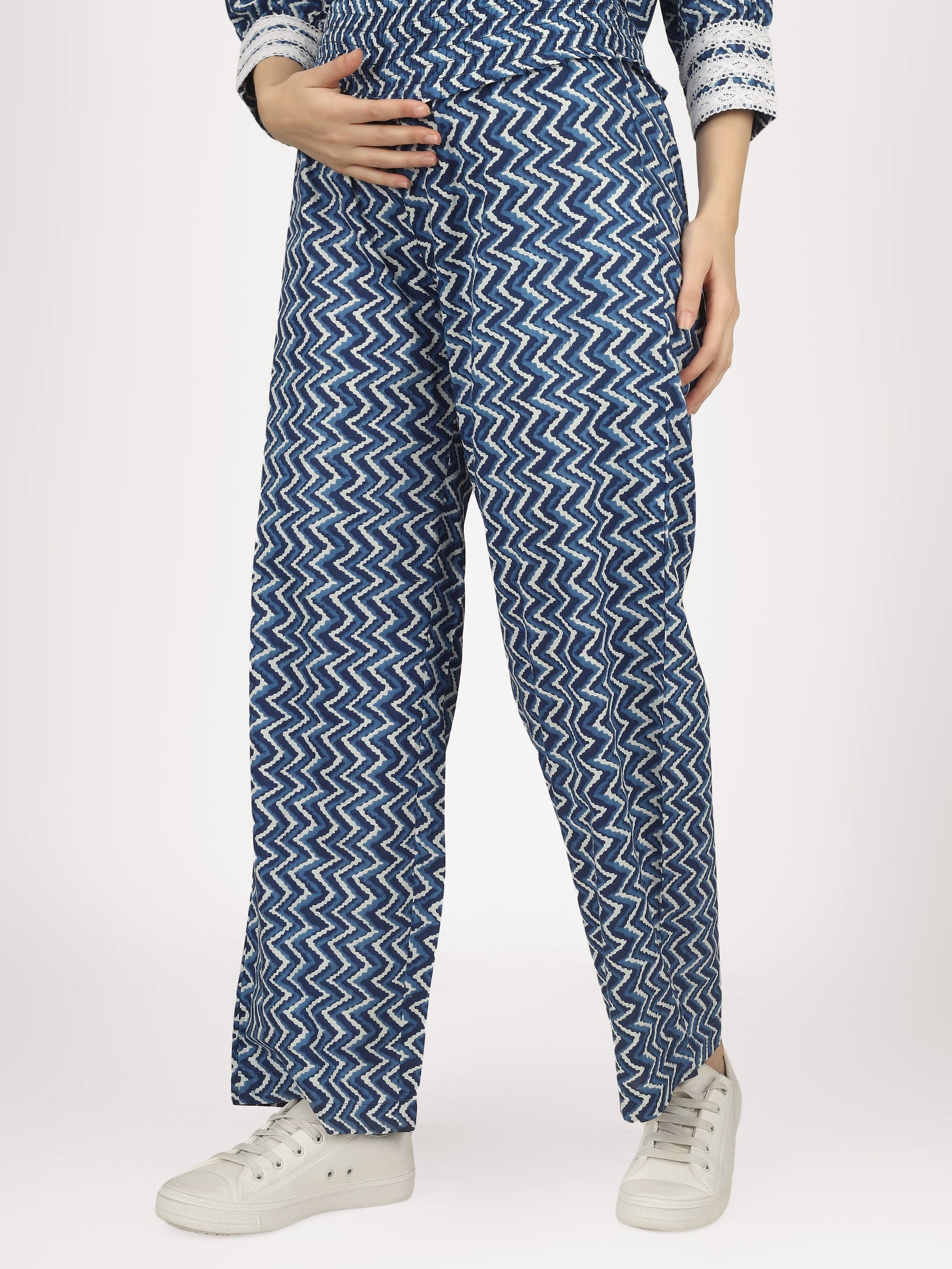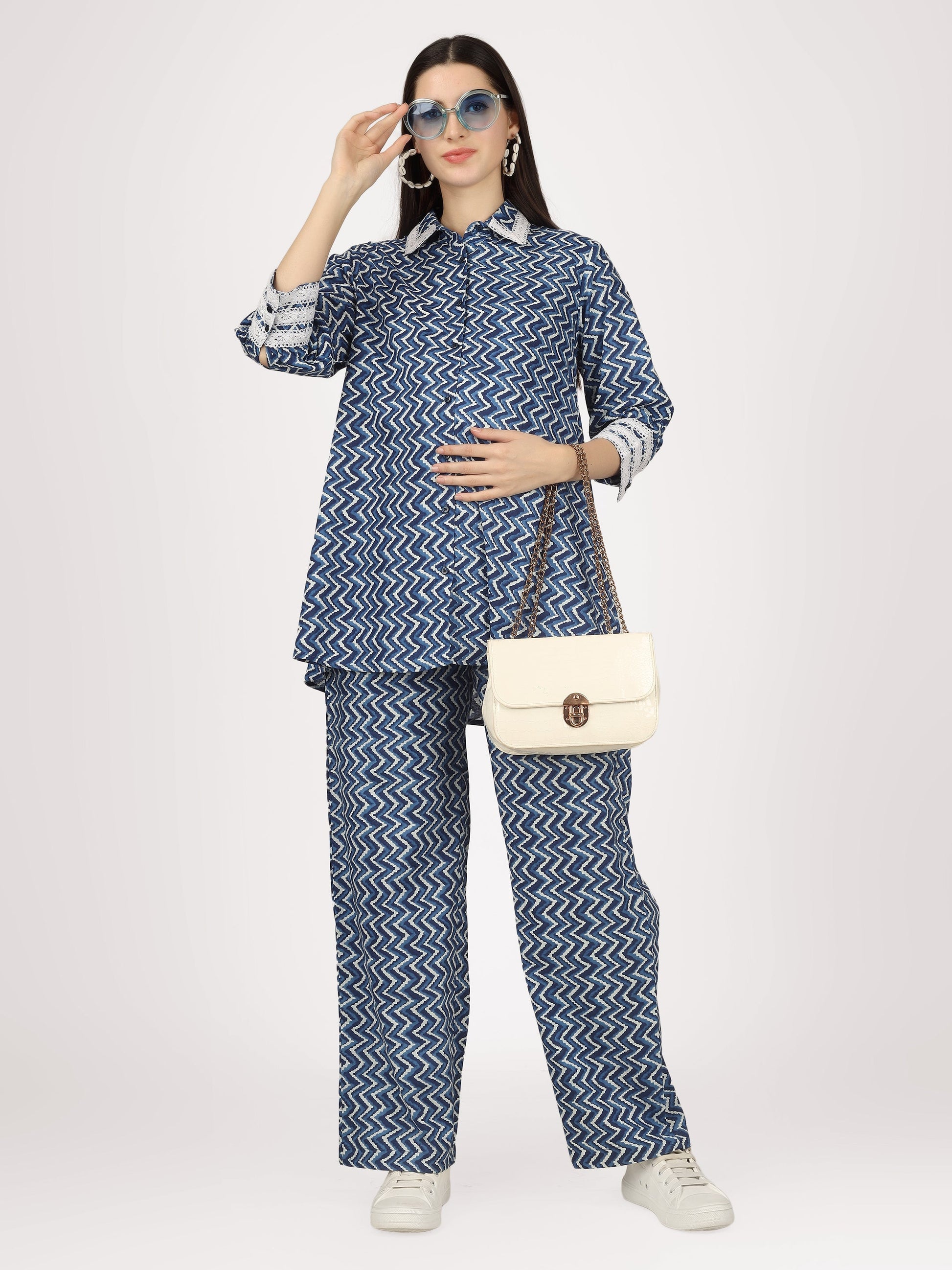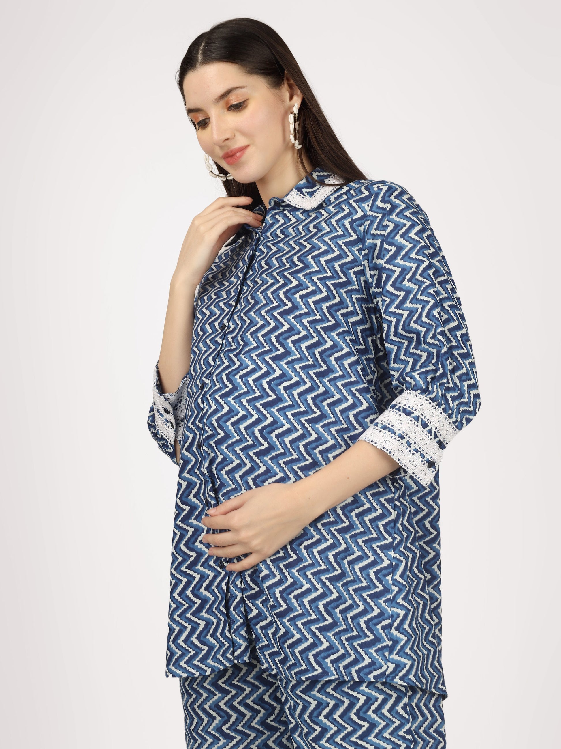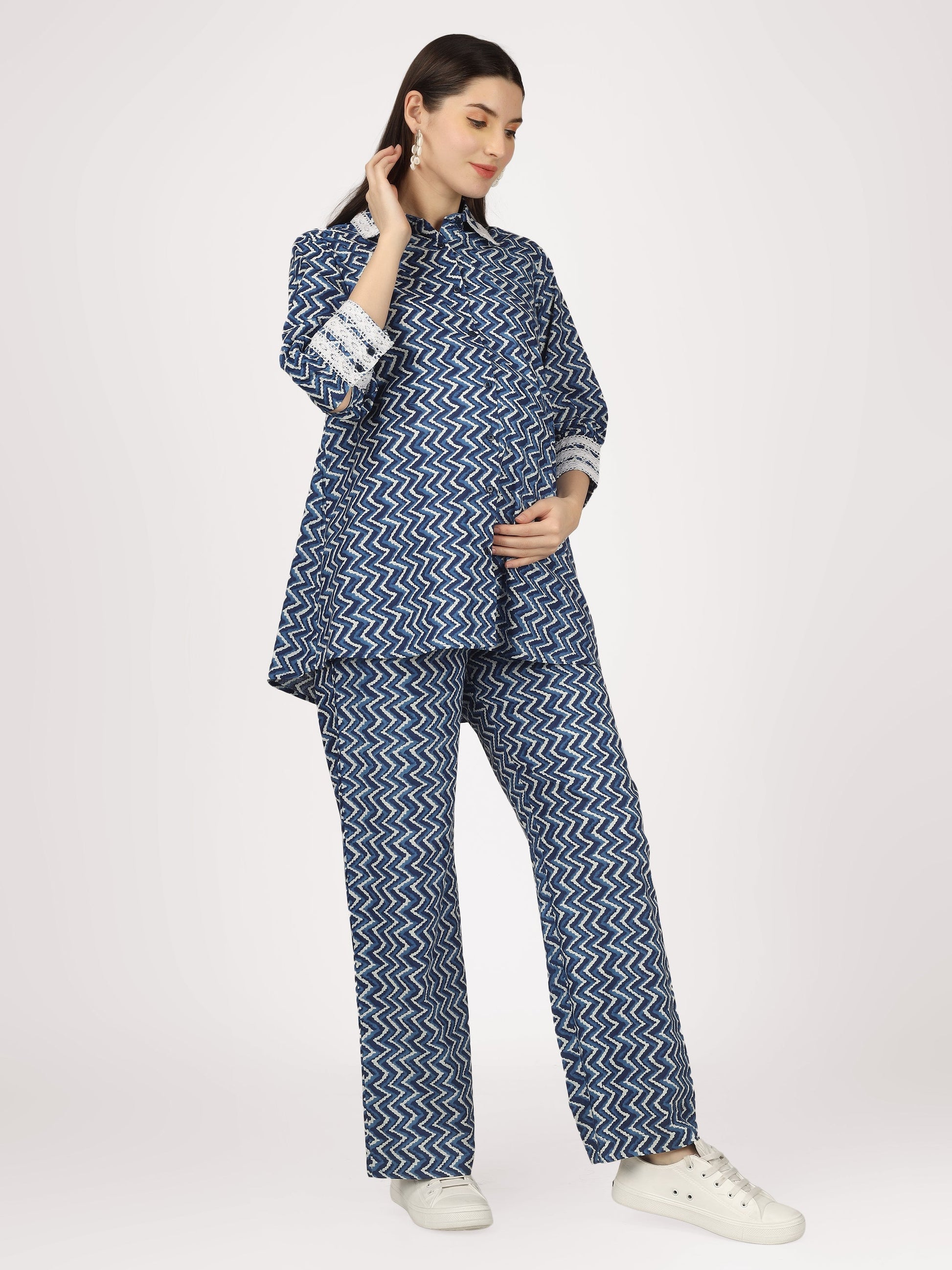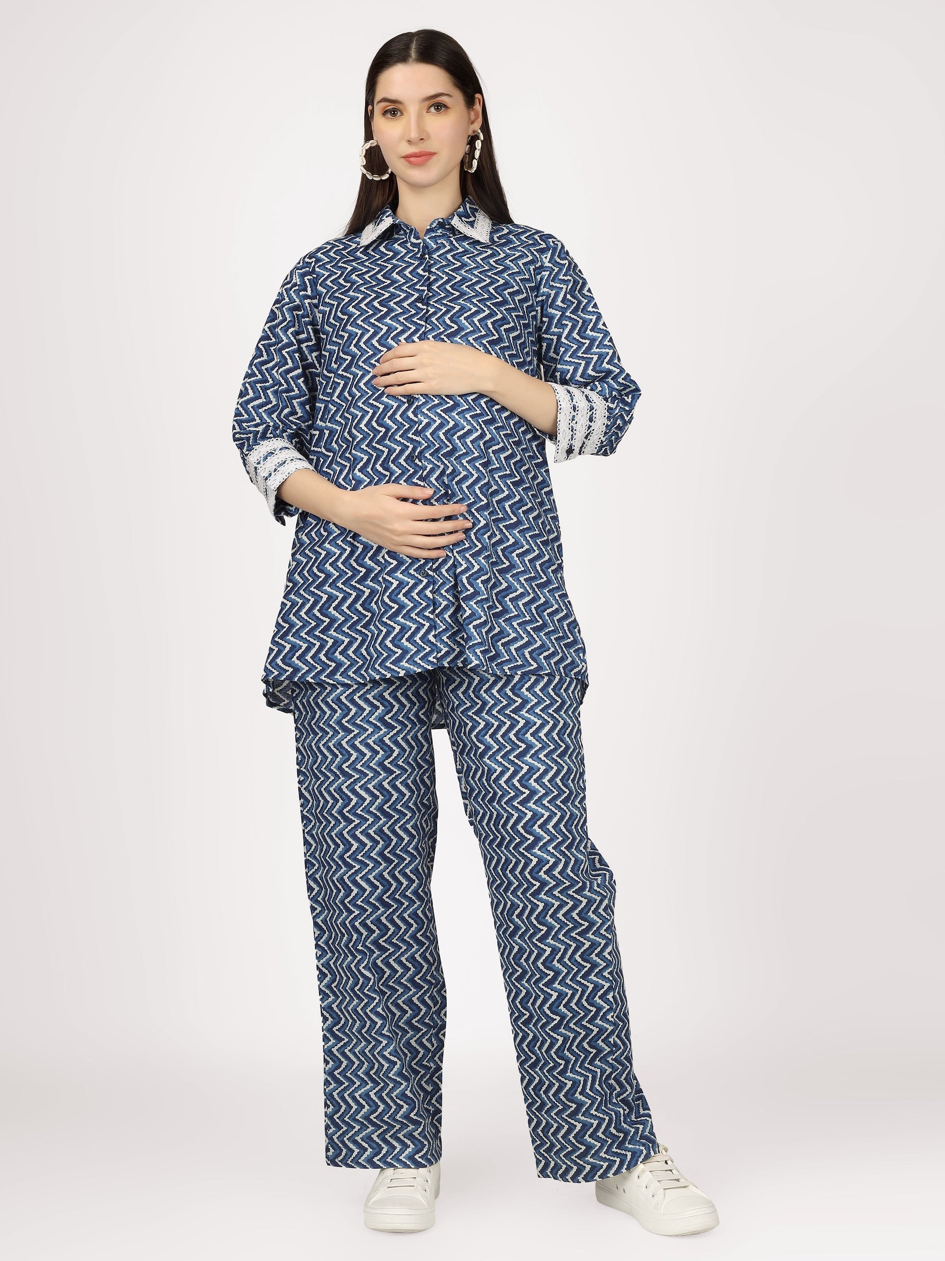 Transform your maternity wardrobe with the Sky & See Blue Cotton Co-Ord Set. This coordinating set features a stylish seamed pant designed to support your growing belly, while delicate lace details add a touch of femininity. Button closures ensure a comfortable and adjustable fit. Elevate your pregnancy style with this must-have set!