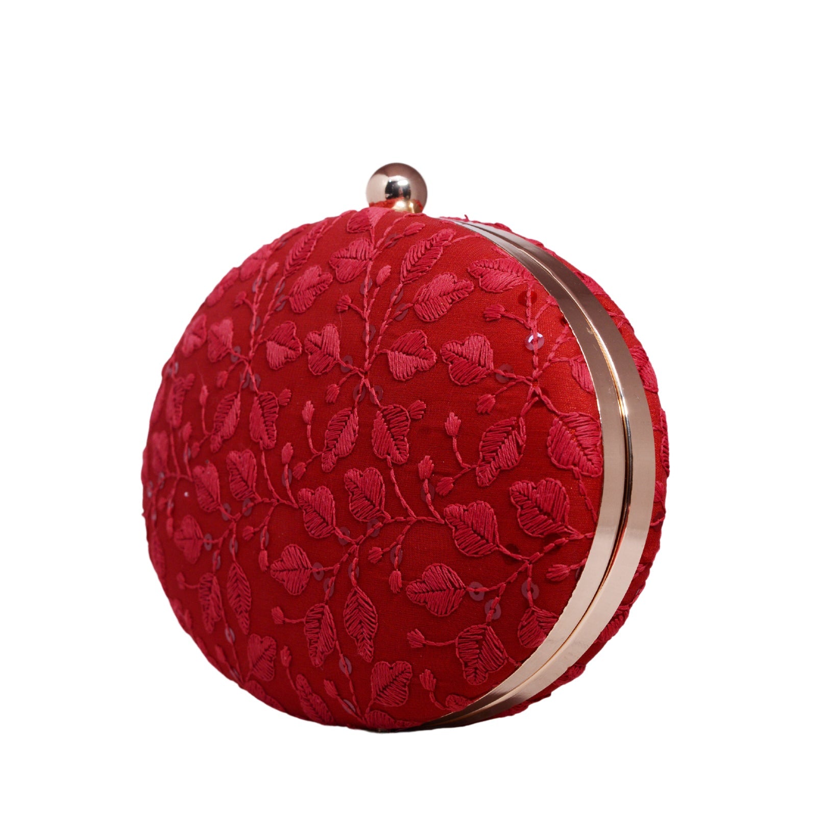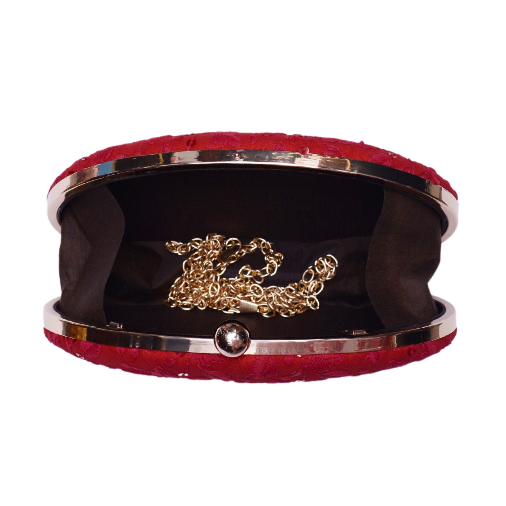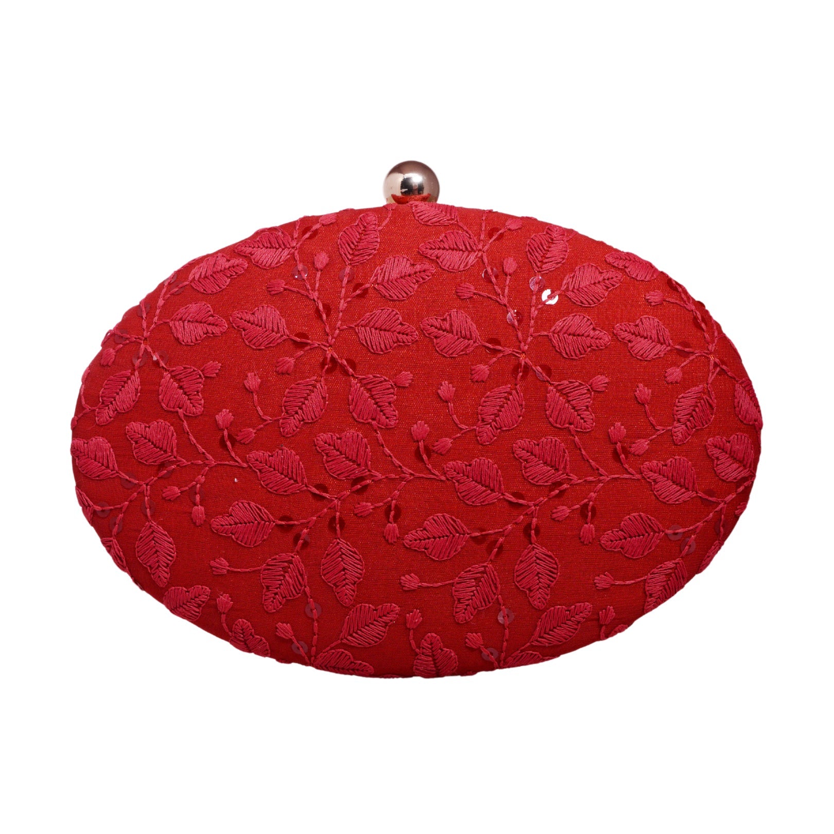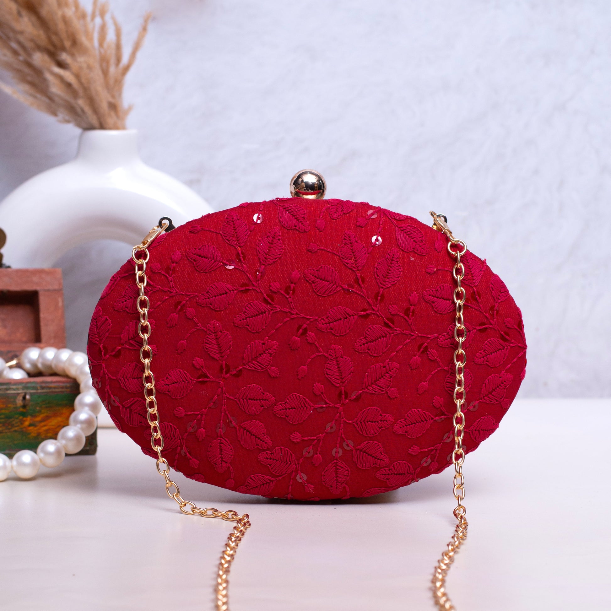 Expertly designed with a metal frame and plastic hard case, this clutch features a sleek combination of zig zag fabric on the outer layer and raw silk fabric on the inner lining. It also includes a click lock button and sling chain , and with dimensions of 8 * 5, it can accommodate phones of various sizes. Experience the perfect blend of style and functionality with this Red Chikankari Oval Clutch